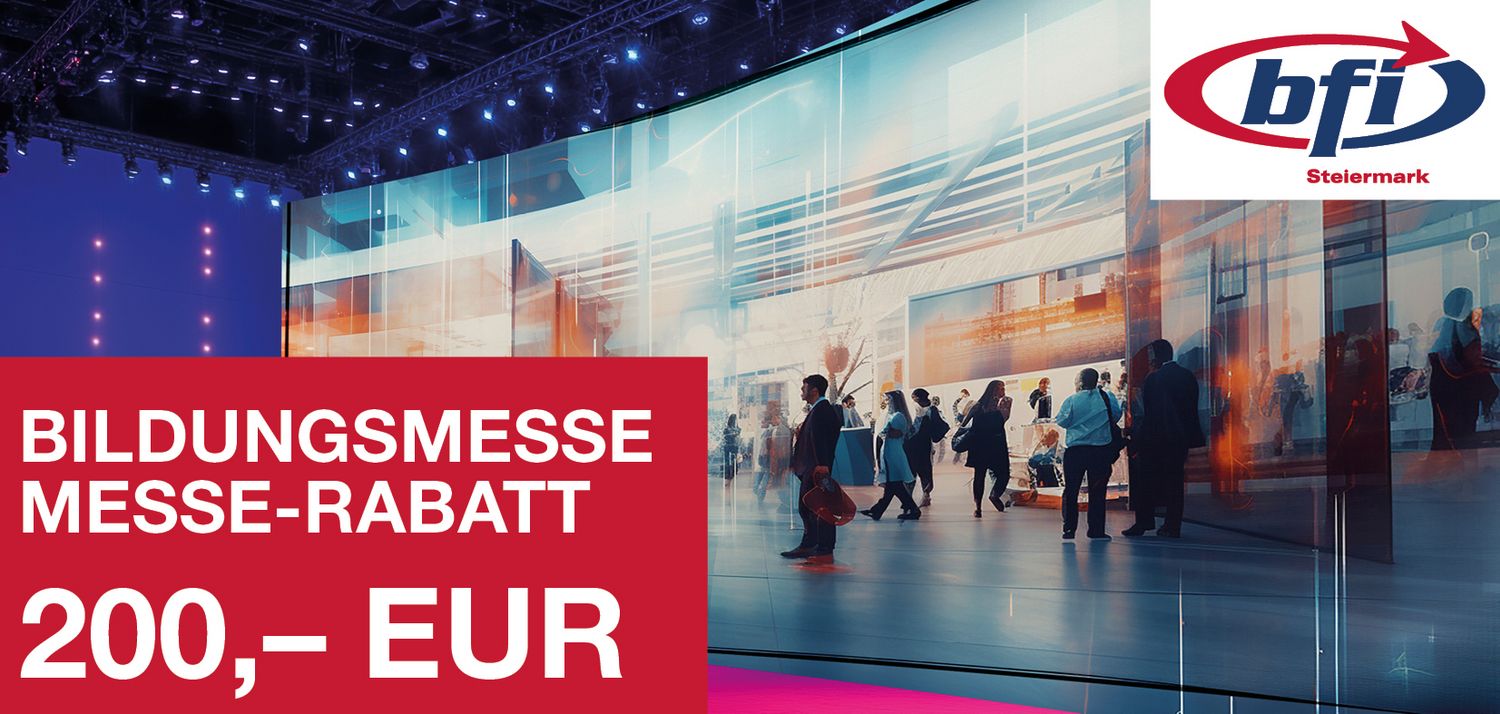 Exklusiv für alle Besucher:innen vor Ort: Erhalten Sie einen Messerabatt in der Höhe von EUR 200,– auf Ihre nächste Aus- oder Fortbildung am bfi Steiermark (gültig ab einem Kurspreis in der Höhe von EUR 650,–).